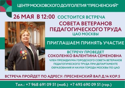 В Центре московского долголетия "Пресненский" состоялась встреча ветеранов педагогического труда ЦАО с представителями Совета ВОВ ЦАО, на которой обсуждалась совместная работа по патриотическому воспитанию в округе.